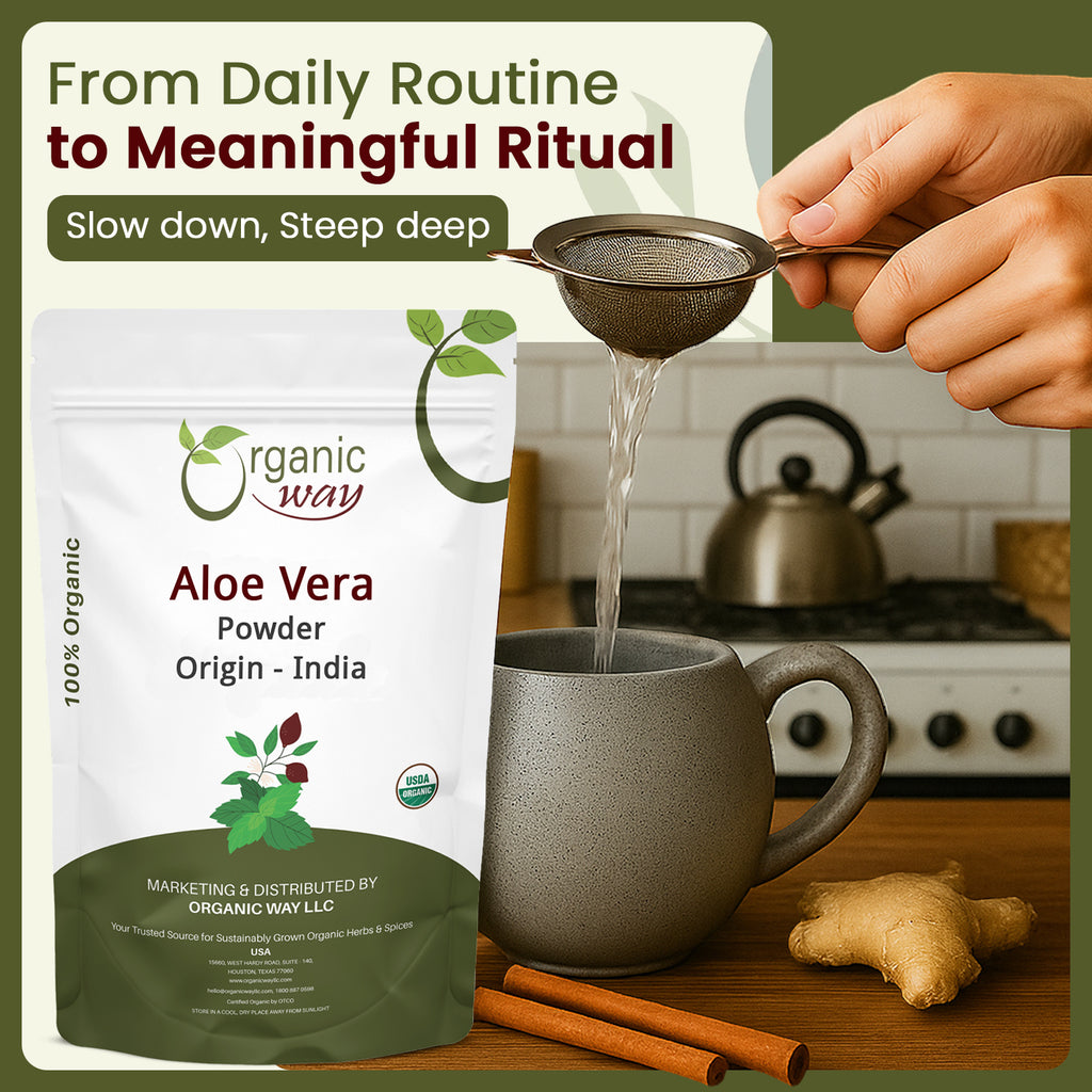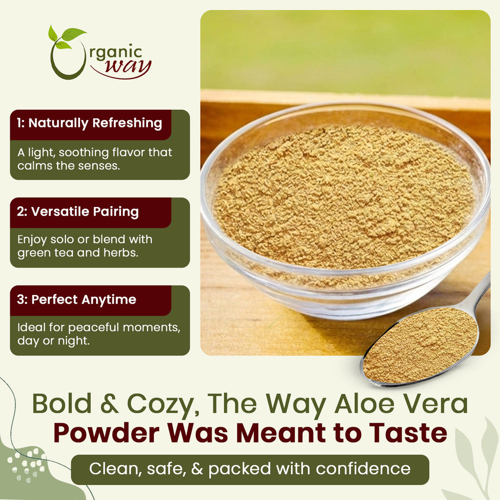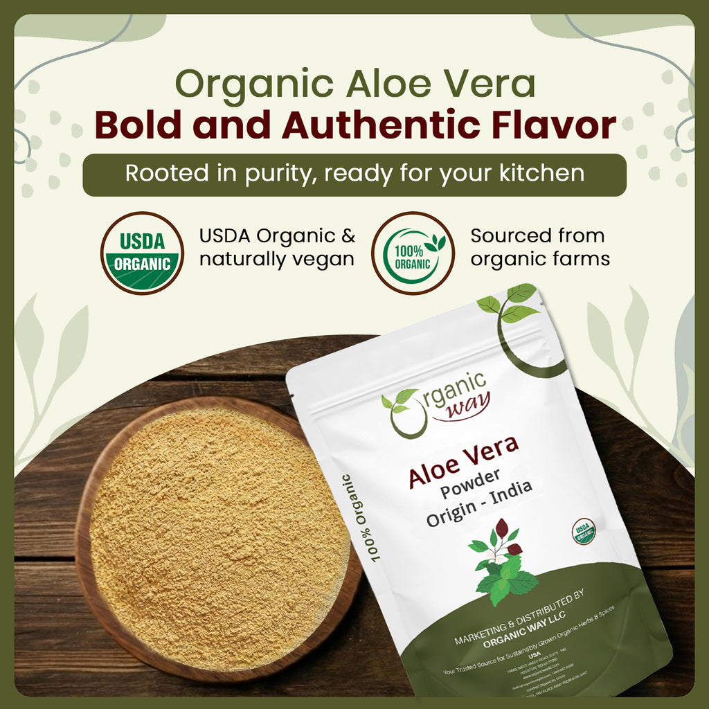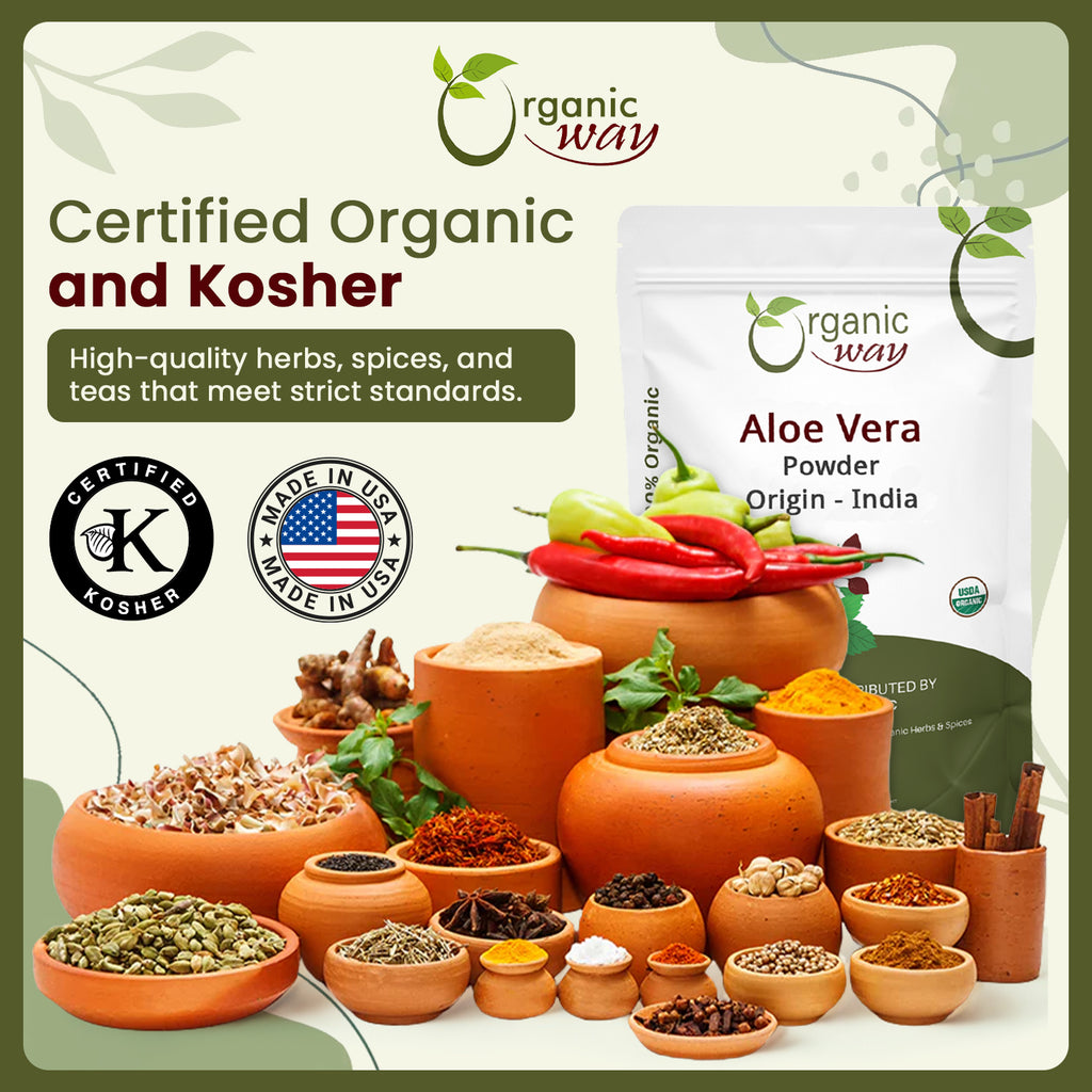 Organic Way’s Aloe Vera is 100% organic Kosher certified product. Aloe Vera needs no introduction. It is popular across the globe as the most effective budget-friendly herbal product with no side-effects whatsoever. Kids, men and women can all use aloe vera powder in their daily diet to keep the skin healthy, hair growth strong and mind and body calm.