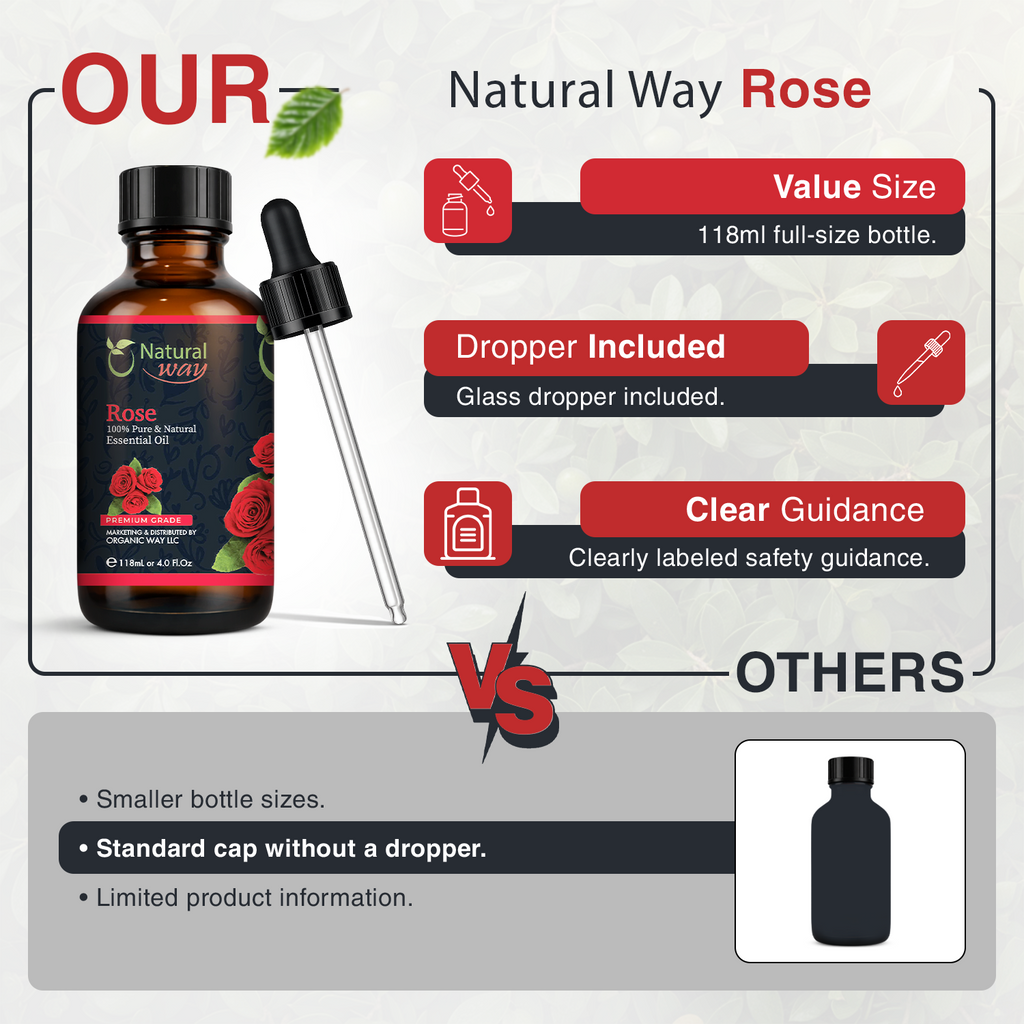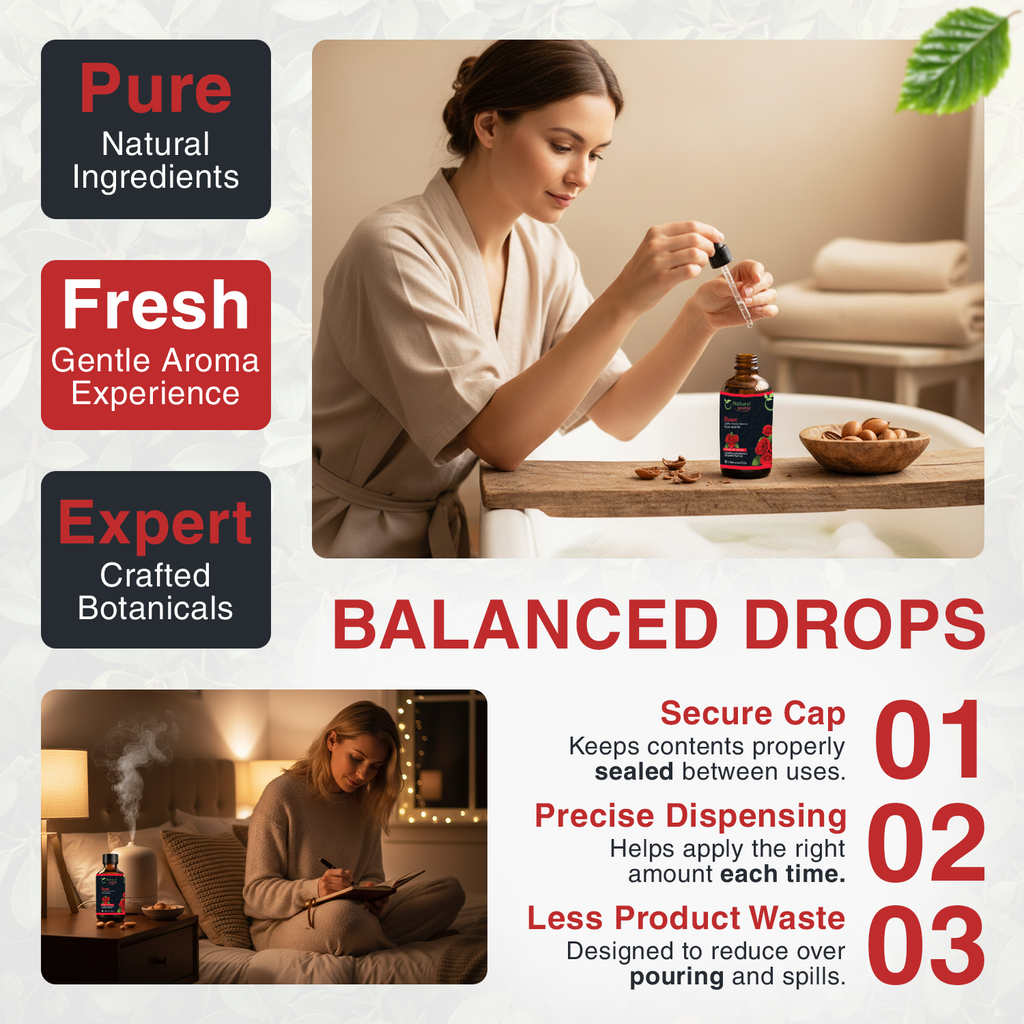 Discover the luxurious essence of our essential rose oil, carefully crafted for exceptional purity and therapeutic-grade quality. This premium oil is steam-distilled to ensure authenticity, offering a deeply soothing experience that promotes relaxation and wellness. The elegant, forest-fresh aroma of this rose oil for hair transforms your environment, creating a calming atmosphere that's essential for meditation, yoga, or unwinding after a long day. This versatile rose oil deeply nourishes and hydrates, revitalizing the skin for a radiant, youthful glow. It also enhances hair health, promoting shine and covering dryness. These aromatherapy oils offer natural hydration without harsh chemicals or additives. Formulated with goods, our essential oils for humidifiers are free from parabens and sulfates. Enjoy the pure benefits of a sustainably sourced oil that enhances your beauty routine and overall wellness. Transform your space with our luxurious essential oils for diffusers for home. Our collection includes high-quality rose oil essential oil, good for creating a calming atmosphere. Designed to blend seamlessly with any diffuser oil, our rose essential oil organic provides a natural, rich aroma that enhances relaxation and rejuvenation. Our essential oils diffusers for home are an ideal choice. For skincare enthusiasts, our rose oil doubles as a nourishing face oil, known for its hydrating and revitalizing properties. These offer a lightweight yet powerful addition to promote a radiant complexion. Use our essential oils diffusers for home & massage oils to elevate your self-care experience, providing both physical and mental wellness benefits.