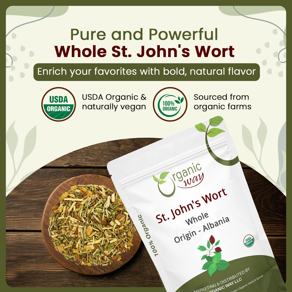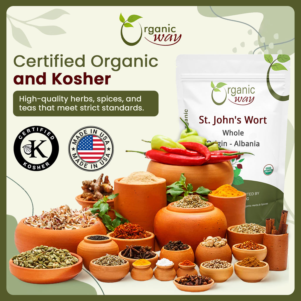 Our St John's Wort is organically grown in Albania and imported to USA after proper examination before import. After microbial and metal testing our products are certified by USDA and Kosher. Organic Way's St. John's wort is a popular herbal product. It offers commonly comes to use for nervousness, tiredness, poor appetite, and trouble sleeping,
